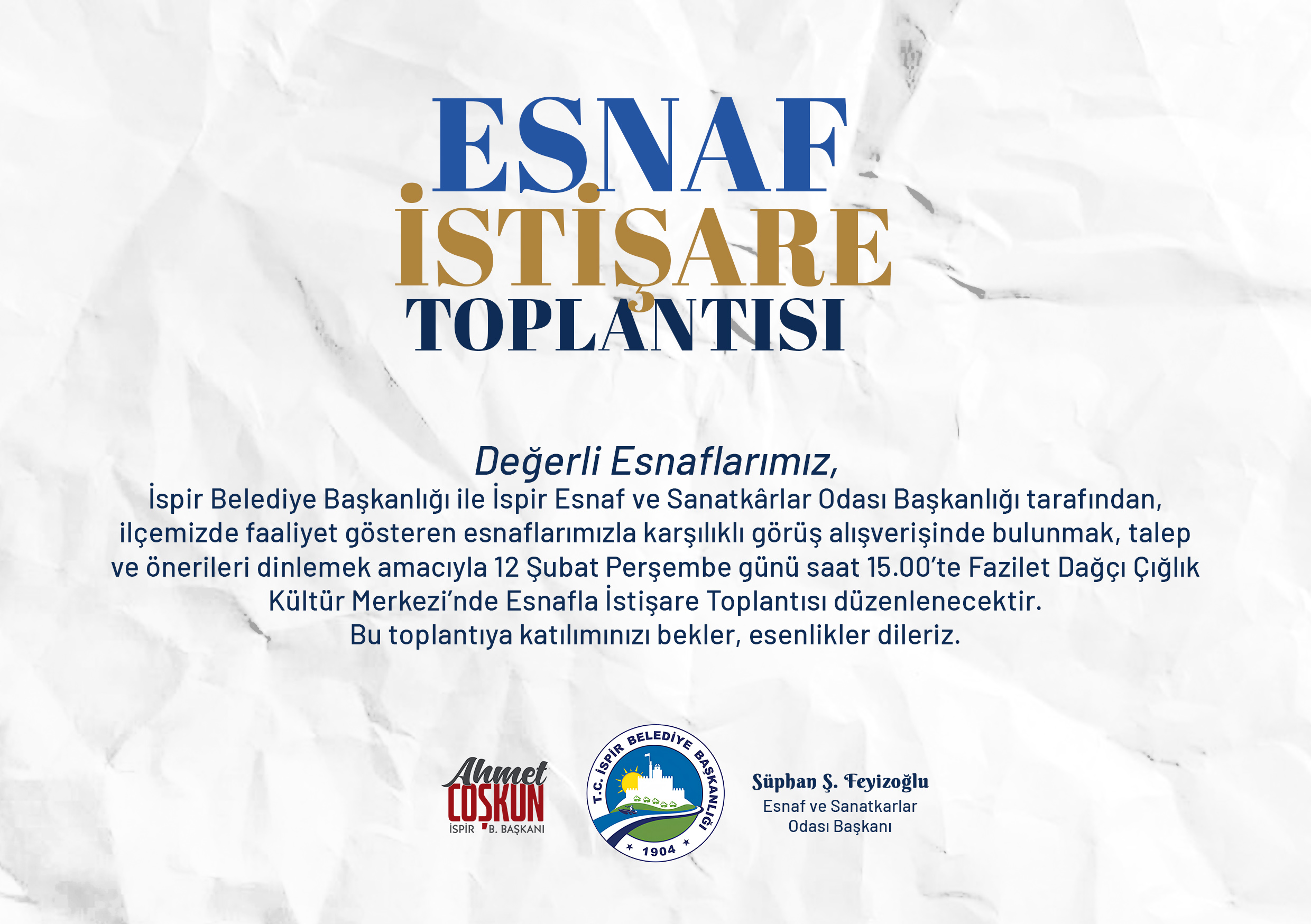 İspir Belediye Başkanlığı ile İspir Esnaf ve Sanatkârlar Odası Başkanlığı tarafından, ilçemizin ekonomik ve ticari hayatının geliştirilmesi, esnaflarımızın karşılaştığı sorunların tespiti, çözüm yollarının birlikte değerlendirilmesi ve yerel kalkınmaya yönelik atılacak adımların istişare edilmesi amacıyla 12 Şubat Perşembe günü saat 15.00’te Fazilet Dağçı Çığlık Kültür Merkezi’nde Esnafla İstişare Toplantısı düzenlenecektir.